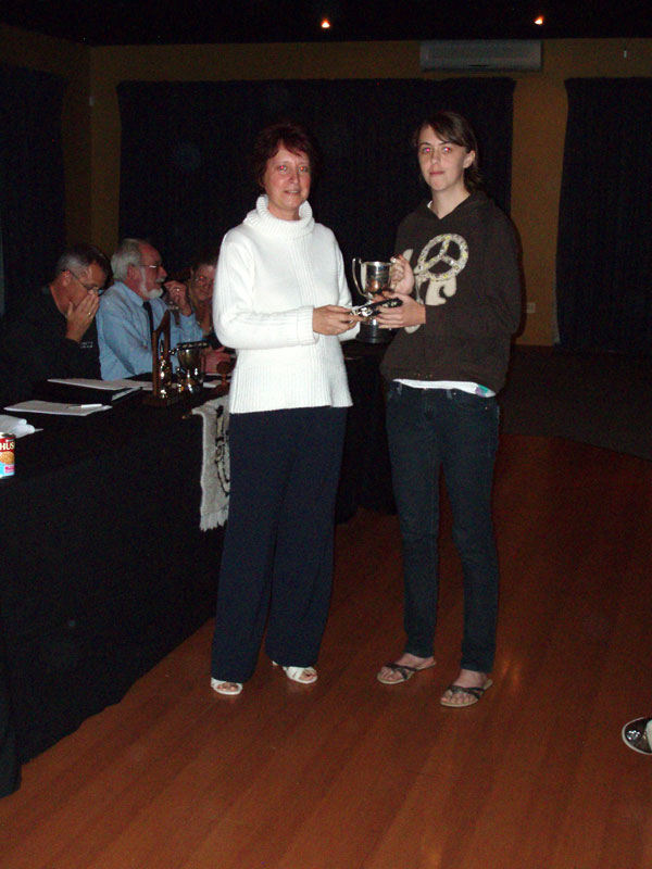 Louise (on right) receives the Frank Bingle Trophy - Dog of the Quarter from Karen (on left) for her dog "Bronte" at the 2009 Annual UDTC AGM.
