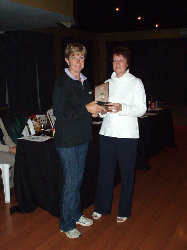 Sue (on left) receives the Concorde Trophy - Best Breed results from Karen (on Right) for her dog "Amber" at the 2009 Annual UDTC AGM.